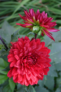 Double-flowering types have multiple rows of petals, grow taller, and have large flowers. Double-flowering types are also classified according to flower size and shape. Cactus dahlias have somewhat tubular shaped petals that curve backwards for over one-half of their length. Semi-cactus dahlias resemble cactus types but the petals are broad at their base and curve for less than half their length. Incurved cactus cultivars have petals that curl strongly towards the center of the flower. There are two types of decorative dahlias: formal and semiformal. Formal decorative types have broad, regularly arranged, pointed or rounded petals that curve back towards the stem. Informal decorative dahlias have long, irregularly arranged, often twisted petals. Ball dahlia flowers are usually 3 1/2 inches in diameter and ball shaped or slightly flattened. The quilled petals are blunt or rounded at the tip. Pompons are smaller version of ball dahlias with flowers less than 2 inches in diameter.