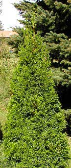 Emerald Green arborvitae is an evergreen tree in the Cypress family. Emerald Green arborvitae usually reaches just 12'-14', with a spread of 3'-4'. Its foliage comes in flat sprays and, if you look closely, the needles appear covered in scales. If the typical dimensions for this plant are still too big for your needs, they can be pruned in early spring (before any new growth) to a size with which you are more comfortable. Since this tree is not drought-tolerant, water well during hot summers and mulch generously to hold in some of that water. Although not drought-tolerant, 'Emerald Green' arborvitae does fine in full sun (it doesn't mind partial shade, however). Grow in a well-drained soil.