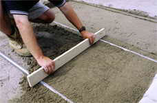 Once the stone base is graded and compacted to within 3” of the final brick grade, 1” thick metal screed rails (poles) are placed on the base at 4-6’ intervals. Concrete sand is then distributed over and between the rails and a straight screed board is drug over them to create a smooth even layer of sand. The poles are removed and sand is filled into the voids prior to brick laying.