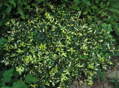 Bright golden variegation is outstanding on this vigorous groundcover shrub. Broad leaves are edged in bright grass green on mounding, compact plants. Spreading habit makes a highly useful, low maintenance filler for beds, along foundations, or for bank and slope coverage. Use as bright accent against darker needled evergreens for winter interest. Use as vivid background or boundary edge for perennial borders. Not particular about soil, provided it is well drained. Withstands heat and drought once mature. Best in full sun but tolerates some shade. Fast growth to 3 feet tall and spreading to 5 feet wide. Cutting grown.
