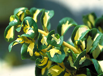Moonshadow Euonymus has evergreen, variegated small yellow and dark green leaves that turn plum purple in the winter. Emerald Gaiety Euonymus can be maintained as a small shrub or, with a little training, will climb trellises and walls.