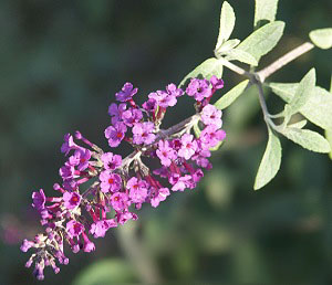 You'll be happier with Buddleia if you accept its growth habit, which is not neat and tidy. Its narrow branches support lilac-like clusters of blossoms a foot or two in length, with side branches and blossoms. After a rainfall, the flower-laden branches of some species can droop all over your flower bed. You'll want to allow at least six feet between bushes to keep some semblance of neatness.