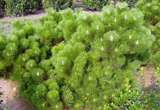 This is an extraordinary pine with bright white, large, extended buds that show well in winter. White buds above heavy, dense, dark green needles. Can grow to 6 ft in 10 years. Each branch is covered with densly packed, dark green needles and crowned in winter with large silver white candles. The candles are as attractive as flowers, and their striking contrast with the foliage is visible over a long distance. Tight, low, mounding habit. Worthy bonsai specimen. Hardy.