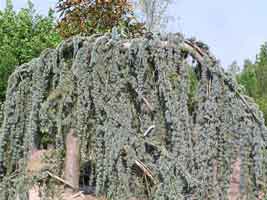 It's difficult to provide dimensions for weeping blue Atlas cedar. It really depends on what you do with it. If you stake it, you can train weeping blue Atlas cedar to grow 10'-12' high, from which height it will cascade down. But if you don't stake it, the plant will look like an amorphous blob bubbling over the landscape. Weeping blue Atlas cedar will grow about 1' per year. Like weeping blue Alaskan cedar, this tree's powder-blue foliage provides year-round visual interest.