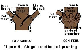 According to Dr. Alex Shigo, USDA Forest Service plant pathologist, thick and heavy branches should be removed flush to the collar at the base of the branch, not flush with the trunk [Figure 6]. The collar is an area of tissue containing a chemically protective zone. In the natural decay of a dead branch, when the decay advancing downward meets the internal protected zone, with an area of very strong wood meets an area of very weak wood. The branch then falls away at this point, leaving a small zone of decayed wood within the collar. The decay is walled off in the collar. This is the natural shedding process when all goes according to nature's plan. When the collar is removed, the protective zone is removed, causing a serious trunk wound. Wood-decay fungi can then easily infect the trunk. If the pruned branch is living, removing the collar at the base still causes injury.