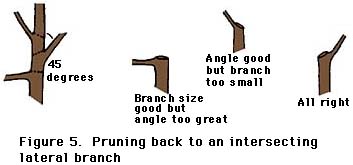 When cutting back to an intersecting [lateral] branch, choose a branch that forms an angle of no more than 45 degrees with the branch to be removed [Figure 5]. Also, the branch that you cut back to should have a diameter of at least half that of the branch to be removed. Make slanting cuts when removing limbs that grow upward; this prevents water from collecting in the cut and expedites healing.