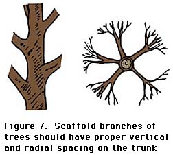 Major scaffold branches of shade trees should be vertically spaced at least 8 inches apart and preferably 20 to 24 inches apart. Closely spaced scaffolds have fewer lateral branches resulting in long, thin branches with poor structural strength.
