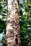 Boring, or tunneling, insects cause damage by boring into the stem, roots, or twigs of a tree. Some lay eggs which then hatch and the larvae burrow more deeply into the wood blocking off the water-conducting tissues of the tree. Boring insects generally feed on the vascular tissues of the tree. If the infestation is serious, the upper leaves are starved of nutrients and moisture and the tree can die. Signs of borer infestation include entry/exit holes in the bark, small mounds of sawdust at the base, and sections of the crown wilting and dying.