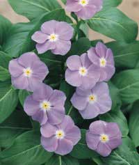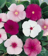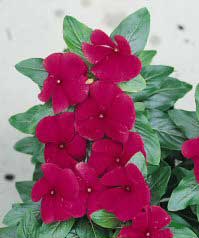 Apricot Delight has flowers white-flushed with apricot and a bright raspberry eye. Blue Pearl is the closest to a blue vinca yet developed. It is a soft lavender blue with a white eye that grows to 18 inches tall. Cooler Series has a uniform growth habit and clear, vibrant colors. Coolers grow to 14 inches tall. Heat Wave Series blooms extra early and grows to only 10 inches tall. Mediterranean is a new series of spreading vinca. They reach only 6 inches tall and spread up to 2 feet wide. They can be used in hanging baskets, window boxes and at the front of the flowerbed. Colors available are lilac and white. Pacifica Series grows to 14 inches tall and has large 2-inch-wide flowers with overlapping petals. This series is well-branched and extra early blooming. It is available in white, pink, rose and light purples with or without contrasting "eyes." Pacifica Red is the first true red vinca. Passion is a striking, deep orchid purple with a yellow eye. It grows 18 inches tall. Tropicana Series is early blooming and has very large, rounded flowers. They grow to 15 inches or more.